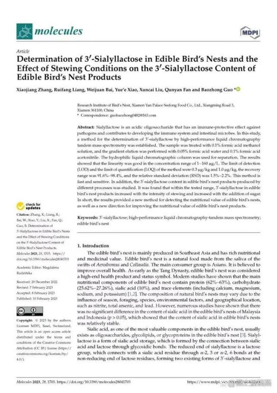 科技創(chuàng)新是產(chǎn)業(yè)發(fā)展的重要源泉和動力。多年來,燕之屋堅持傳承中國滋補文化的同時,結(jié)合現(xiàn)代科研技術(shù)深入研究,充分挖掘燕窩的營養(yǎng)價值及功效?,F(xiàn)代研究發(fā)現(xiàn),“燕窩富含蛋白質(zhì)、氨基酸、唾液酸和無機(jī)元素等,具有抗氧化、改善免疫、抑制血凝、調(diào)節(jié)腸道菌群等功效(來自:白偉娟等.《燕窩成分及功效研究進(jìn)展》,2020)。”在燕之屋燕窩研究院科研團(tuán)隊新近發(fā)布的研究成果中,基于開創(chuàng)性地建立的燕窩中3'-唾液酸乳糖的LC-MS/MS測定方法,及兩年的跟蹤研究發(fā)現(xiàn)3'-唾液酸乳糖作為一種更容易吸收的唾液酸形態(tài),適當(dāng)?shù)臒踔笥兄谘喔C中的唾液酸向更易吸收的3'-唾液酸乳糖的形態(tài)轉(zhuǎn)化。研究表明,“碗燕產(chǎn)品中3'-唾液酸乳糖含量顯著高于家庭燉煮燕窩(100℃ 30min)(來自:國際權(quán)威期刊《Molecules》,Determination of 3'-Sialyllactose in Edible Bird's Nests and the Effect of Stewing Conditions on the 3'-Sialyllactose Content of Edible Bird's Nest Products)。”如燕之屋旗下高端燕窩品牌碗燕飛天款的3'-唾液酸乳糖含量相對于于燉煮燕窩高達(dá)20余倍,表明燕之屋專利燉煮工藝(專利號:ZL201410393800.4 ;專利名稱:一種速食燕窩軟罐頭的制作方法)能夠激發(fā)燕窩的營養(yǎng)活性,提升燕窩產(chǎn)品的營養(yǎng)價值(來自:燕之屋燕窩研究院,碗燕產(chǎn)品五維營養(yǎng)分析報告)。”此外,燕之屋燕窩研究院科研團(tuán)隊一直以來燕之屋始終堅持走“研發(fā)立企、創(chuàng)新興企”之路,基于研究成果不斷對產(chǎn)品進(jìn)行升級和創(chuàng)新,致力于為消費者打造更為科學(xué)、營養(yǎng)、健康的產(chǎn)品。截止至2023年8月1日,燕之屋發(fā)表論文共計44篇,其中SCI 11篇。