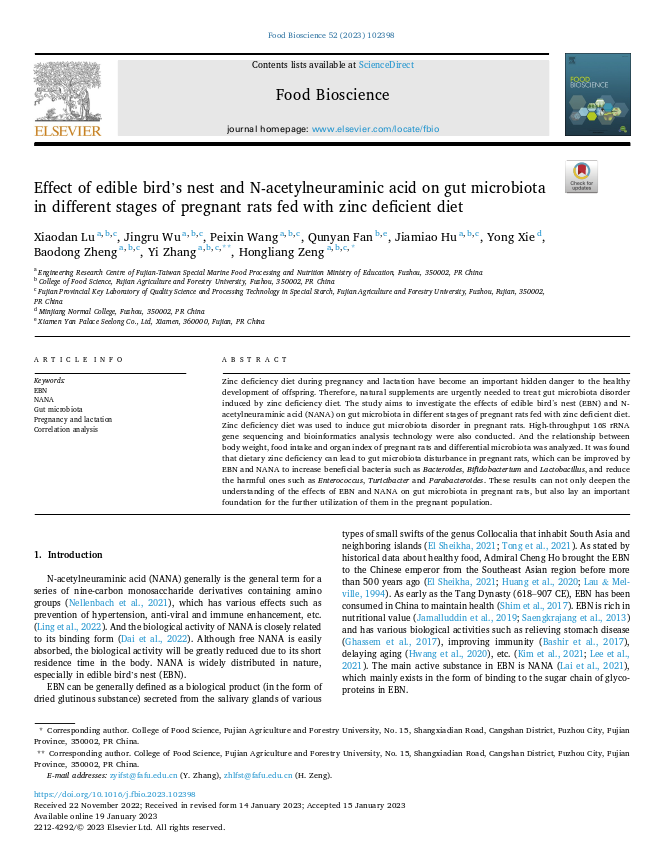 近年來,人們愈發(fā)關注腸道健康,越來越多的證據(jù)顯示,腸道菌群能夠通過產生菌群代謝產物、影響機體免疫反應、調節(jié)迷走神經及干預腸內分泌系統(tǒng)等多種途徑和神經系統(tǒng)相互作用?;诖?,燕之屋聯(lián)合各大高校持續(xù)對食用燕窩的有益作用展開深入研究。今年1月,燕之屋關于“Effect of edible bird’s nest and N-acetylneuraminic acid on gut microbiota in different stages of pregnant rats fed with zinc deficient diet(食用燕窩和N-乙酰神經氨酸對低鋅飲食孕鼠不同時期腸道菌群的影響)”的研究成果被食品科學領域國際知名SCI期刊《Food Bioscience》收錄。