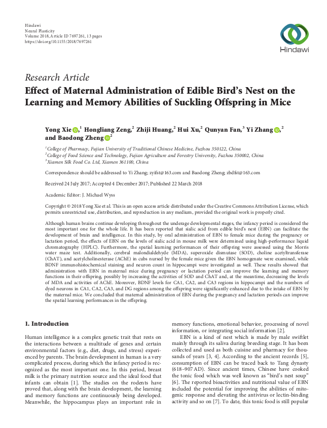 早在2018年3月,燕之屋關于“Effect of Maternal Administration of Edible Bird’s Nest on the Learning and Memory Abilities of Suckling Offspring in Mice(母鼠食用燕窩對子代學習記憶能力的影響)”的研究成果就登上了食品科學領域國際知名SCI期刊《Neural Plasticity》。研究結果表明,食用燕窩提升了子代腦內海馬體中CA1,CA2和CA3區(qū)域的BDNF(一種神經營養(yǎng)因子)水平及CA1,CA2,CA3和DG區(qū)域的染色神經元數(shù)量,這標志著子代學習記憶能力的提升。該項研究推測食用燕窩通過增強超氧化物歧化酶和膽堿乙酰轉移酶的活性,同時降低腦內丙二醛的水平和乙酰膽堿酯酶活性,來緩解氧化應激損傷、改善子代的學習記憶能力,是業(yè)界首次揭示母體食用燕窩對改善子代學習記憶能力的作用及機制的研究。