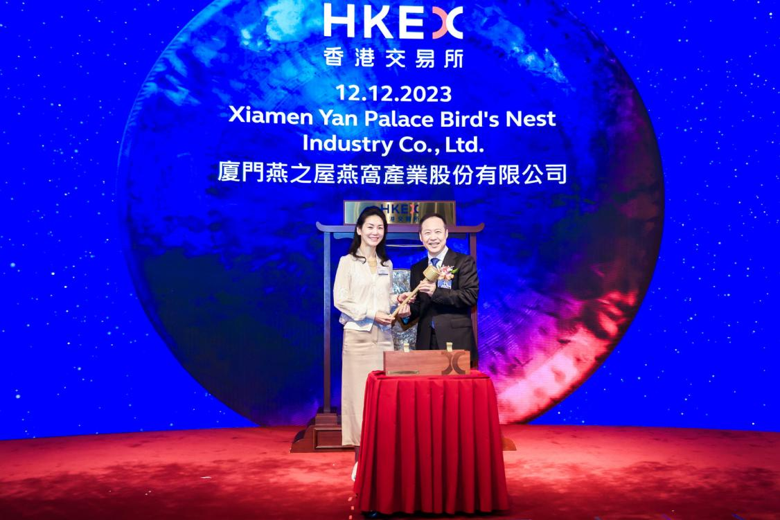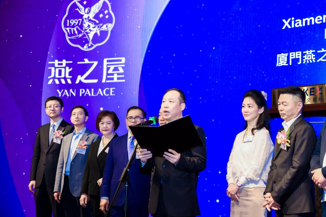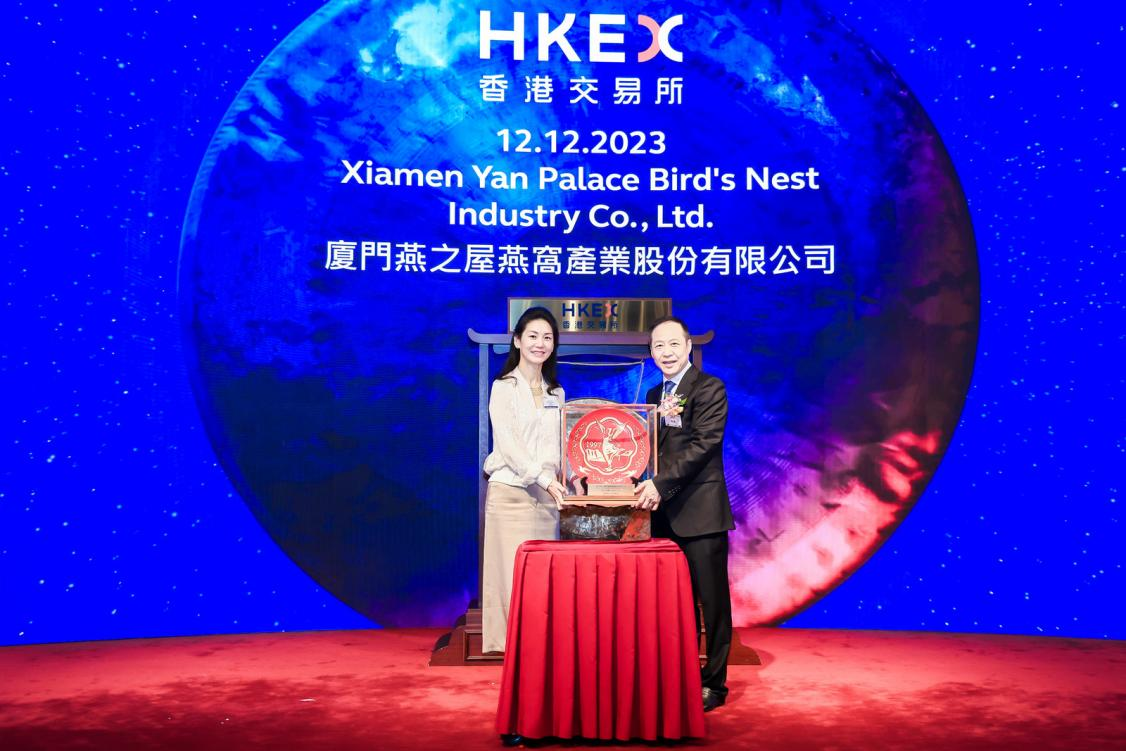 隨后,香港交易所上市委員會委員吳燕安上臺為燕之屋頒贈紀念品,燕之屋創(chuàng)始人、執(zhí)行董事兼董事長黃健代表接受,并回贈禮品?,F場,燕之屋企業(yè)短片亮相大熒幕,燕之屋香港交易所上市儀式圓滿完成。