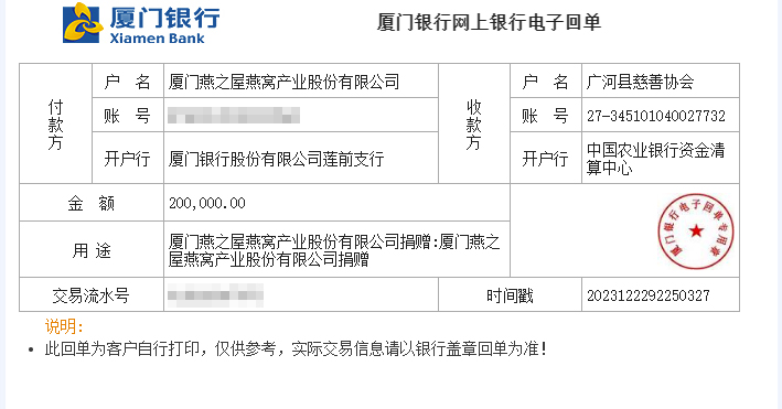 圖:燕之屋向甘肅省臨夏州積石山縣捐贈(zèng)救災(zāi)資金20萬元