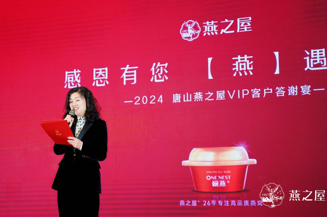燕之屋* 26年專注高品質(zhì)燕窩(*燕之屋指燕之屋企業(yè)),不僅以匠心工藝和創(chuàng)新科技傳承東方滋補文化,更是以優(yōu)質(zhì)產(chǎn)品和精心服務(wù)滋養(yǎng)每一位消費者。晚宴開場前,燕之屋輪番播放企業(yè)宣傳片,分享企業(yè)的發(fā)展與榮光,邀大家共同領(lǐng)略品牌文化。傍晚六點零六分,答謝宴在燕之屋唐山市場客服部的舞蹈串燒中拉開帷幕。燕之屋唐山合作商、河北法桐商貿(mào)有限公司總經(jīng)理趙寧上臺致辭,她說道:“感謝大家在百忙之中來參加今天的VIP客戶答謝宴,使得這個美好的時刻更加璀璨奪目。在這個特殊的場合,我想表達我們對每一位貴賓的深深感激。您們的支持和信任是我們前行的動力源泉,也正是因為您們的支持,才有了今年燕之屋在港交所的成功上市(股票代碼:01497.HK)。愿我們今天共享美好時光,祝各位身體健康,事業(yè)蒸蒸日上!”