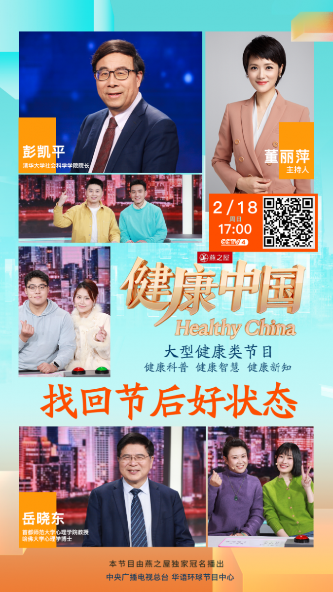 本期,由燕之屋獨(dú)家冠名的CCTV-4大型健康類(lèi)欄目《健康中國(guó)》特邀首都師范大學(xué)心理學(xué)院教授、哈佛大學(xué)心理學(xué)博士岳曉東和清華大學(xué)社會(huì)科學(xué)學(xué)院院長(zhǎng)彭凱平教授,以及北京大學(xué)第三醫(yī)院運(yùn)動(dòng)醫(yī)學(xué)科的苗欣博士,與您共同探討如何找回節(jié)后好狀態(tài)。