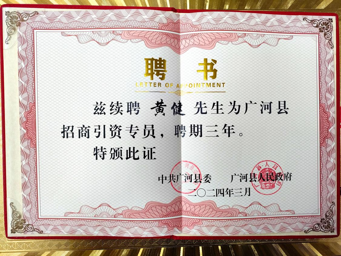 圖:燕之屋創(chuàng)始人、執(zhí)行董事兼董事長(zhǎng)黃健被續(xù)聘為廣河縣招商引資專(zhuān)員