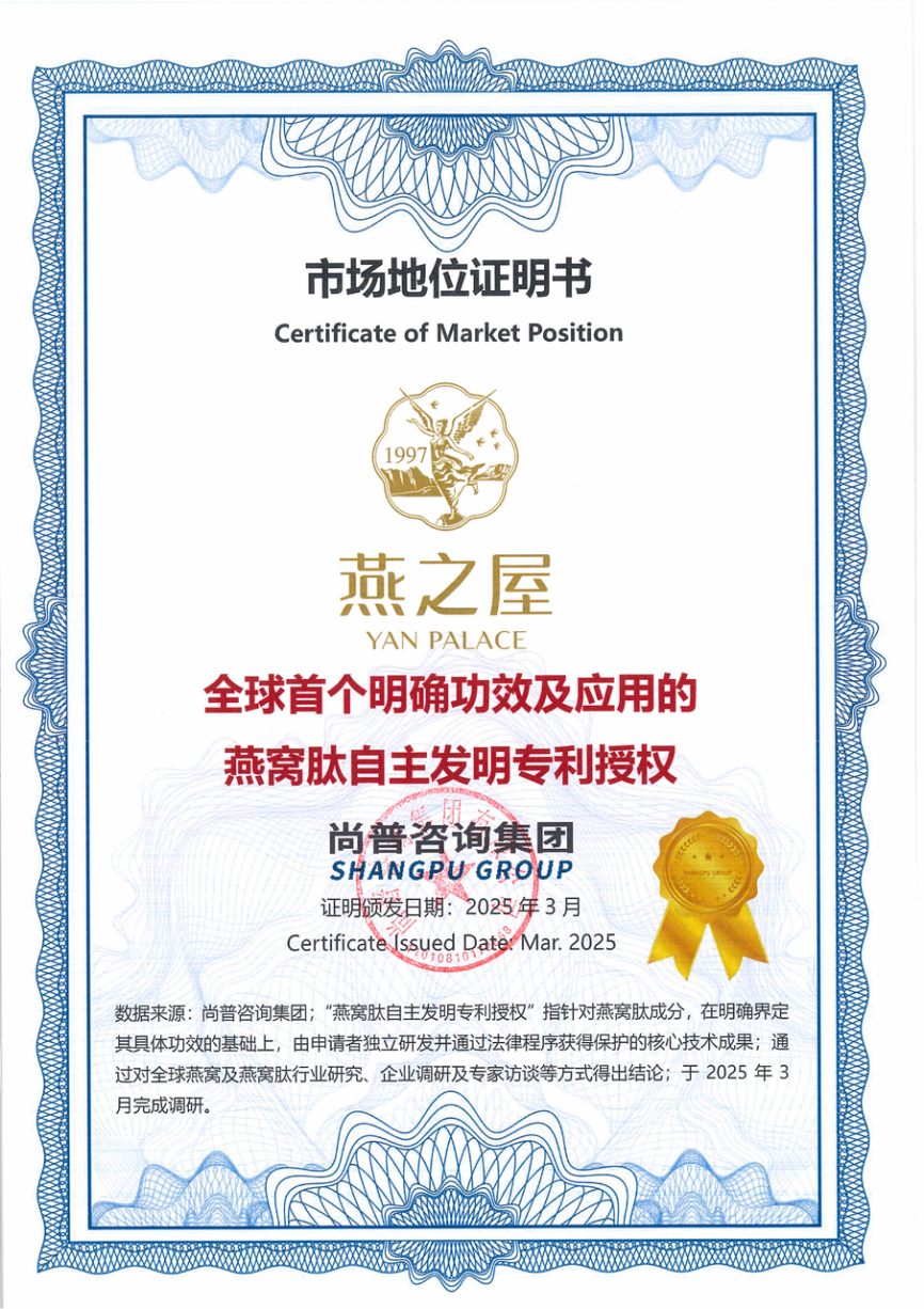科研實力的卓越體現(xiàn),在于能否攻克行業(yè)共性難題并建立核心技術(shù)標準。燕之屋在燕窩肽領(lǐng)域取得關(guān)鍵突破,于2025年經(jīng)權(quán)威第三方機構(gòu)尚普咨詢集團專業(yè)認證,獲得“全球首個明確功效及應(yīng)用的燕窩肽自主發(fā)明專利授權(quán)①”市場地位證明書。該項認證所基于的核心專利《一種具有促進細胞修護、高保濕美白功效的燕窩肽制備方法及應(yīng)用》(專利號:ZL 2022 11398048.3),徹底改變了傳統(tǒng)燕窩肽“成分模糊、功效籠統(tǒng)”的行業(yè)局面。該專利①明確了燕窩肽的定向酶解工藝,能夠?qū)⒀喔C大分子蛋白質(zhì)精準切割為平均分子量小于3000道爾頓(Da)的活性小分子肽段。通過此工藝制備的燕窩肽,其促進細胞修護、高效保濕及抗氧化等核心功能特性①獲得了明確界定與保護,為產(chǎn)品的科學(xué)有效性奠定了堅實的法律與技術(shù)基石。