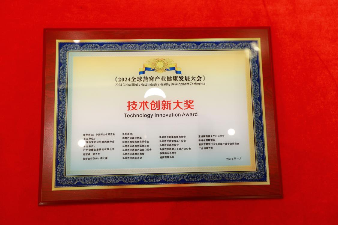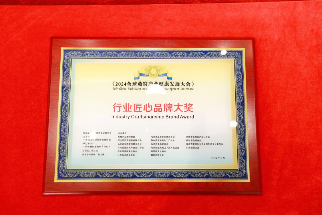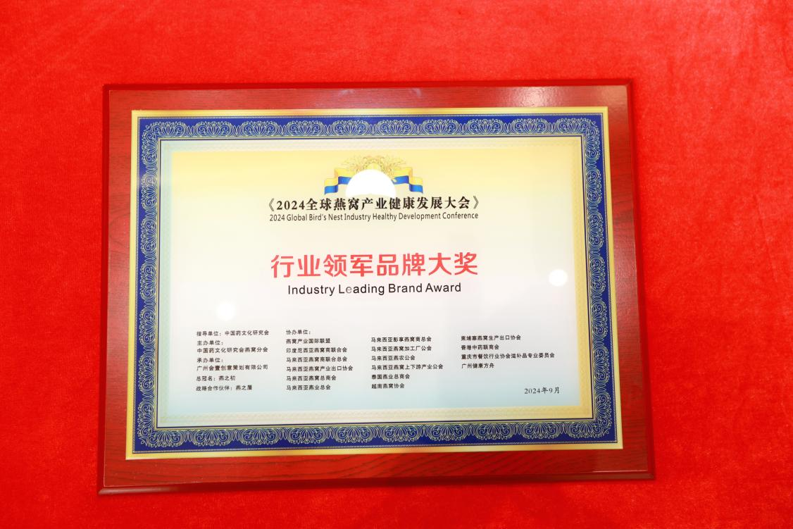9月23日,在榜樣的力量一行業(yè)表彰盛典上,燕之屋憑借先進(jìn)的創(chuàng)新引領(lǐng)力、卓越的產(chǎn)品競(jìng)爭(zhēng)力、強(qiáng)勁的品牌影響力榮獲行業(yè)領(lǐng)軍品牌大獎(jiǎng)、行業(yè)匠心品牌大獎(jiǎng)、技術(shù)創(chuàng)新大獎(jiǎng),燕之屋創(chuàng)始人、執(zhí)行董事兼董事長(zhǎng)黃健榮獲行業(yè)領(lǐng)軍人物;燕之屋傾情助力2024全球燕窩產(chǎn)業(yè)健康發(fā)展大會(huì),進(jìn)一步推動(dòng)燕窩產(chǎn)業(yè)的創(chuàng)新發(fā)展,促進(jìn)燕窩文化的傳承與交流,為行業(yè)的繁榮貢獻(xiàn)力量,獲頒《2024全球燕窩產(chǎn)業(yè)健康發(fā)展大會(huì)》戰(zhàn)略合作單位,并成為《2024全球燕窩產(chǎn)業(yè)健康發(fā)展大會(huì)》唯一指定碗燕即食燕窩品牌,燕之屋公關(guān)總監(jiān)楊航上臺(tái)領(lǐng)獎(jiǎng)。