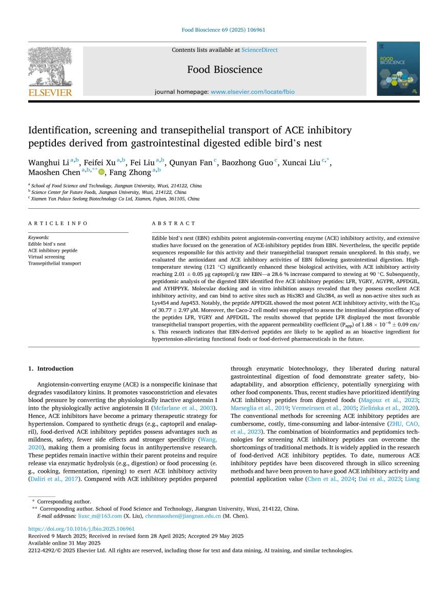 ⑥Identification, screening and transepithelial transport of ACE inhibitory peptides derived from gastrointestinal digested edible bird's nest(燕窩消化后衍生的ACE抑制肽的鑒定、篩選及跨上皮轉(zhuǎn)運)[J]. Food Bioscience, 2025: 106961.